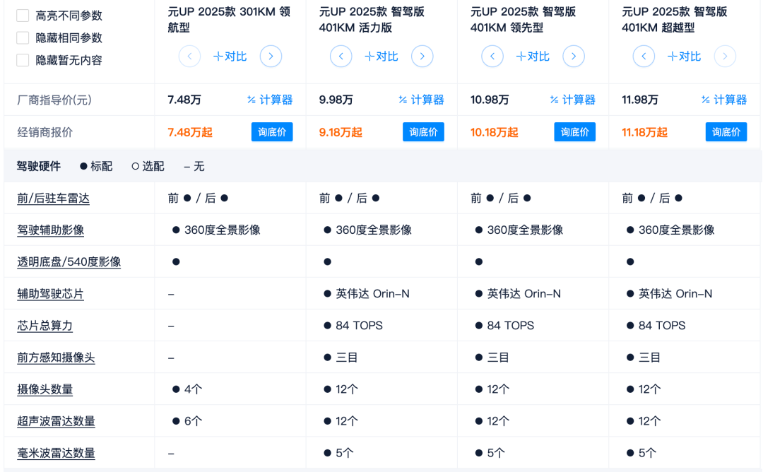 本周,比亚迪旗下热销车型之一的元UP,推出了一款售价7.48万的“低配”车型,和2025款的智驾版最低配相比,价格直降2.5万元;和2024款同车型相比,价格直降2.2万元。